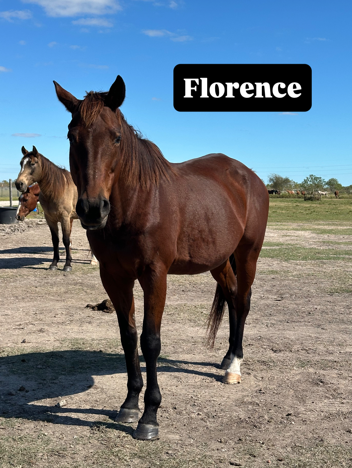 Florence had an extensive race career where she earned over $155k on the track. After that, she became a broodmare and ended up with HfH as a coming senior mare. She is sound and absolutely loves being around people! Florence is a prolific cribber.