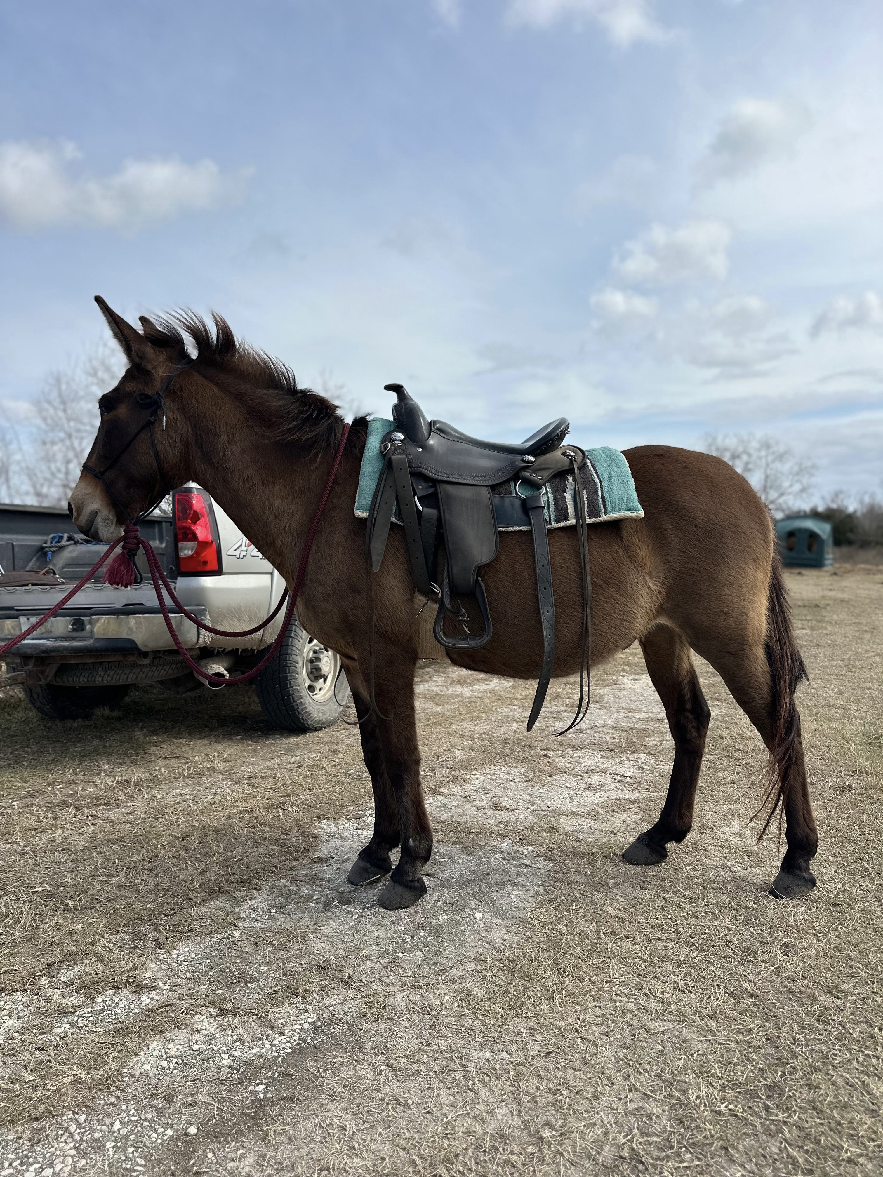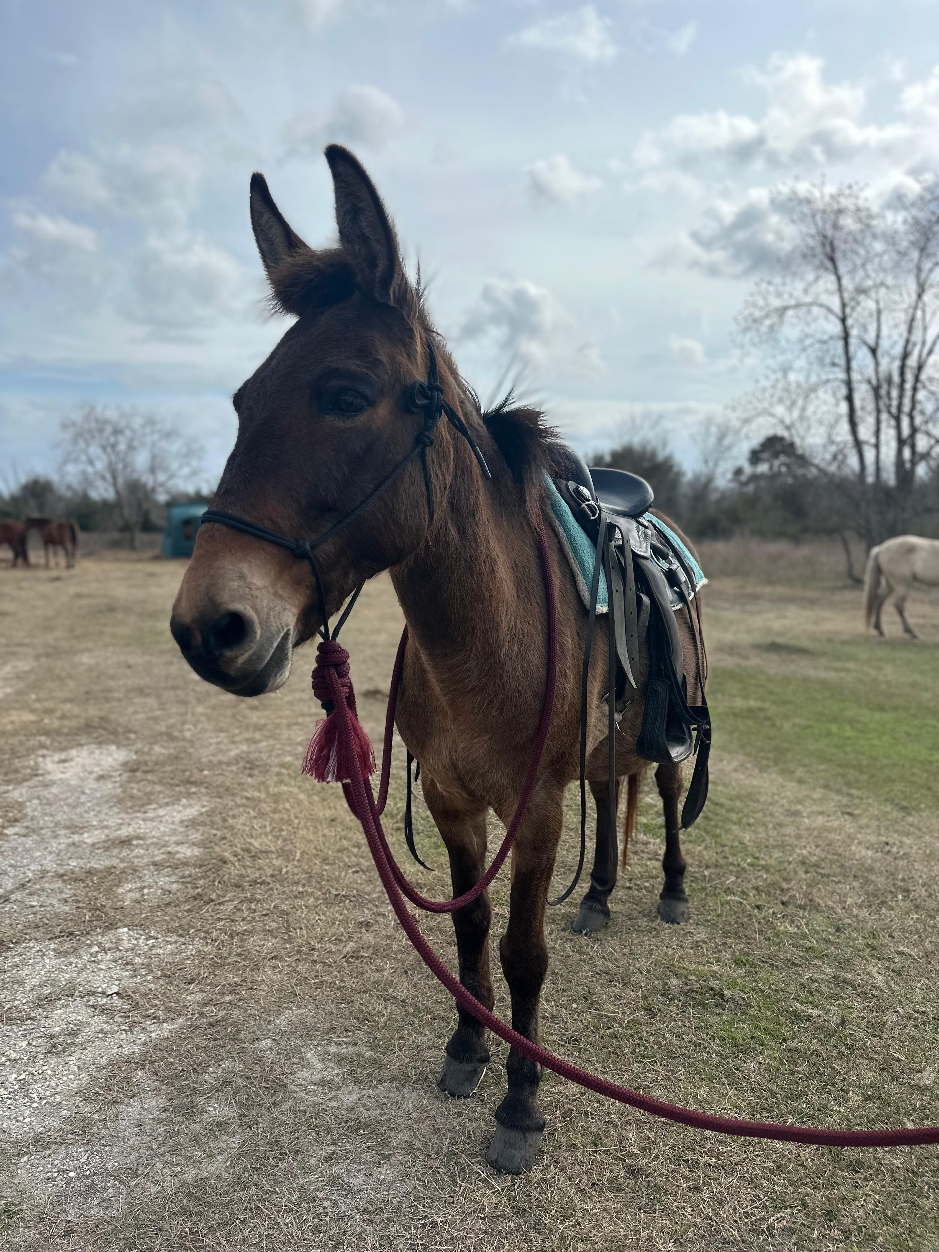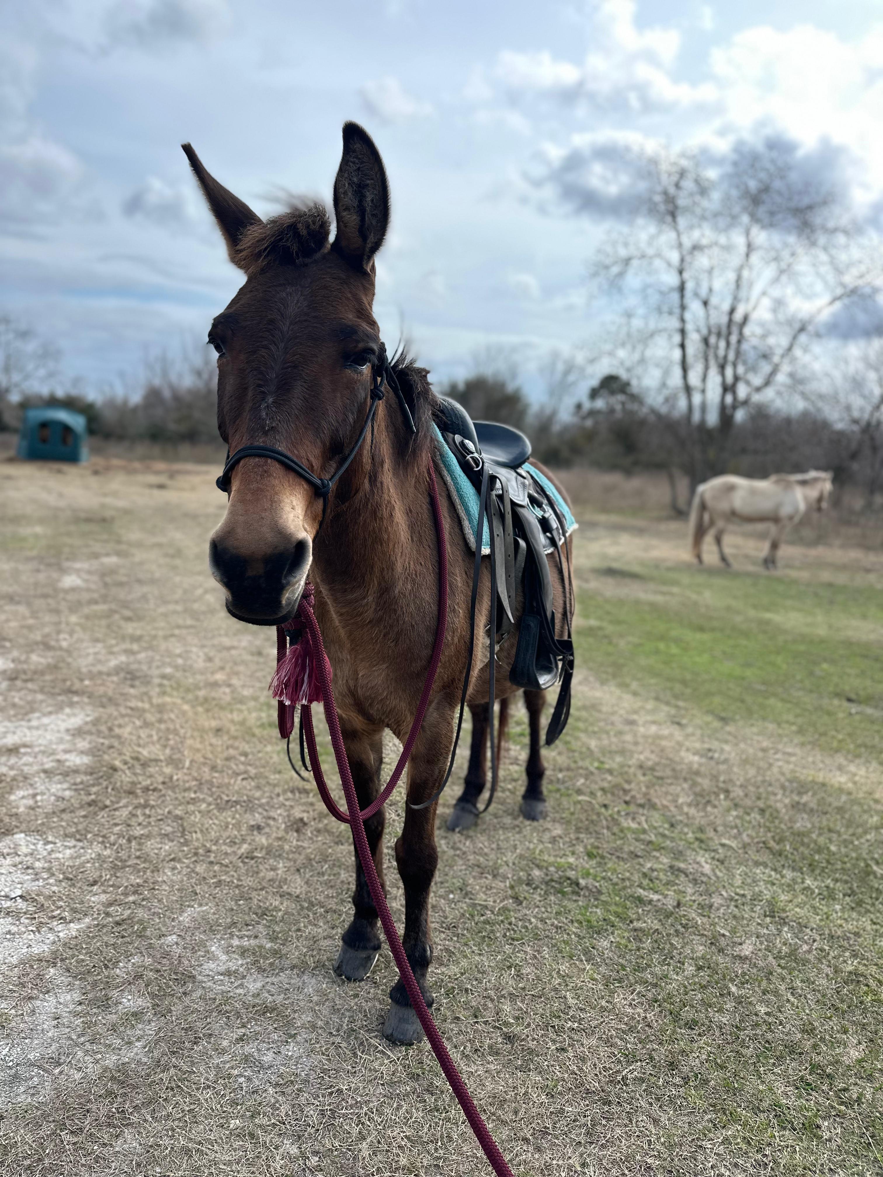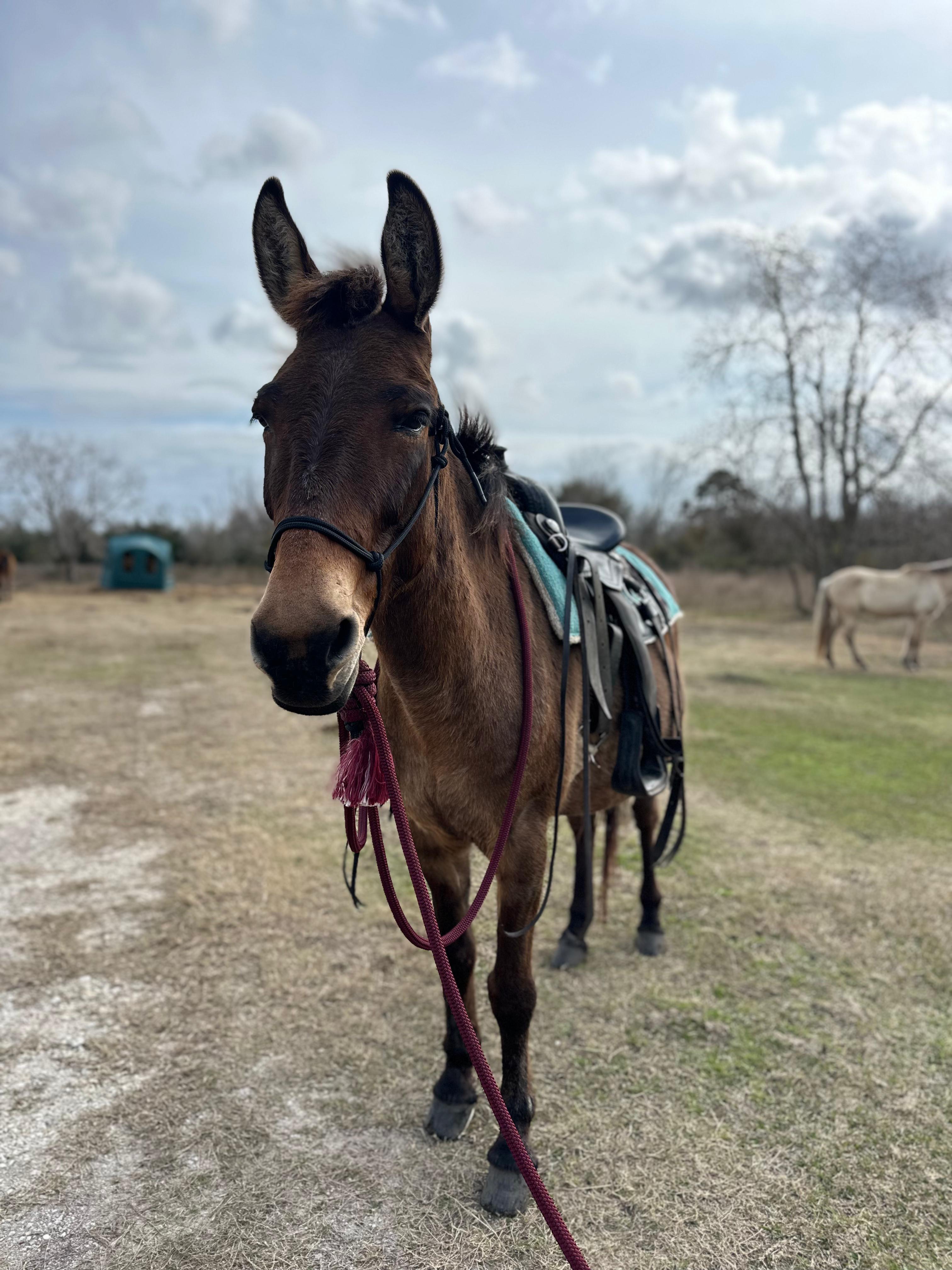 Described as smart, sweet, patient, willing, charming, and handsome by one foster, Henderson has recently returned to our ranch in search of a new home. He is trained to ride and with some refresher training he will make a fantastic trail partner and friend. He's social with people and other animals alike and walks very well on halter. He has been known to escape his pastures on occasion when bored or kept alone, so keeping this smart guy busy or with equine friends will be important in his new home. Sound like your kind of mule? Come meet him today!