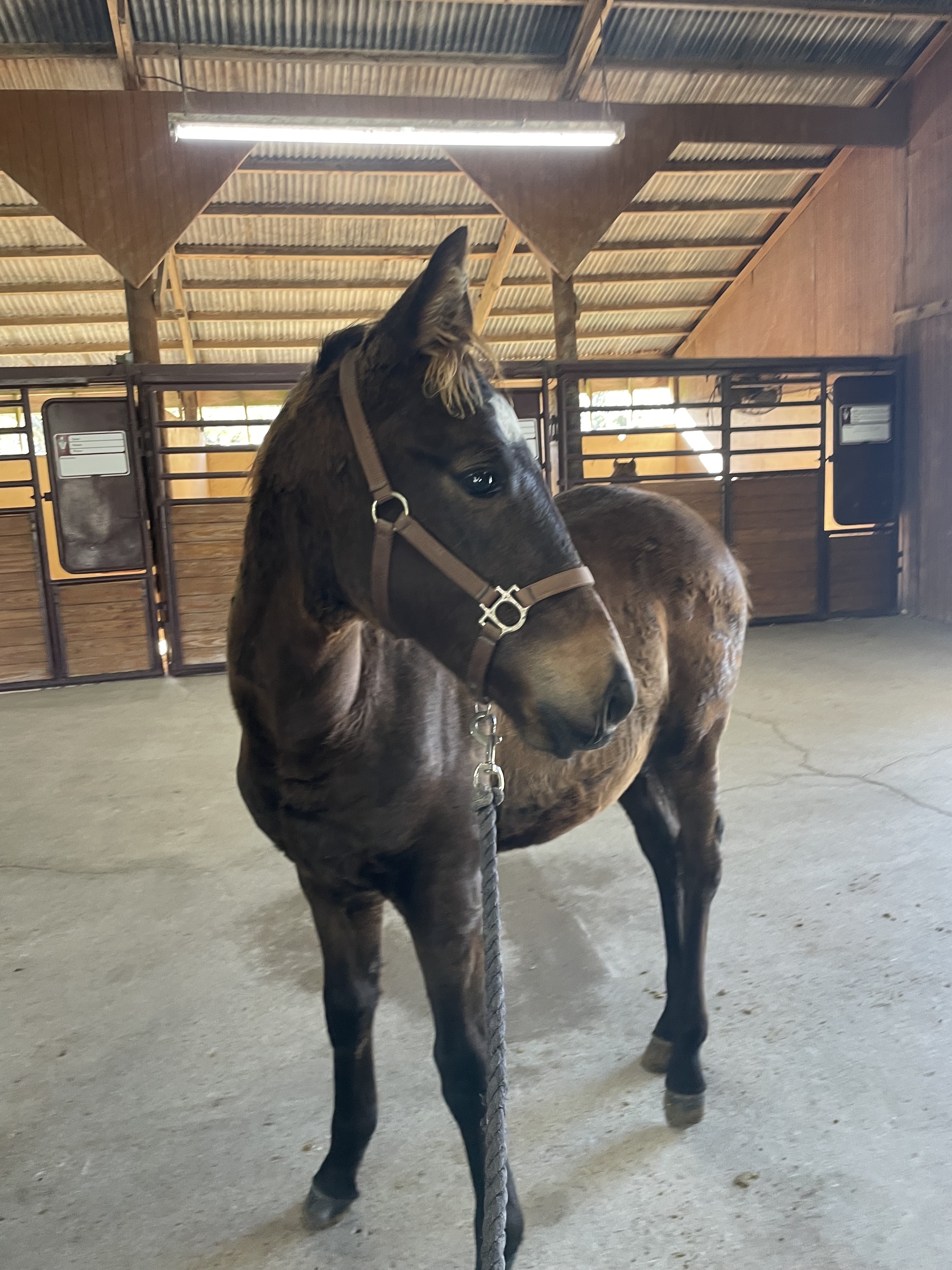 Ludwig II came to us as an unhandled young foal. Since then, he has come out of his shell to be a curious, unflappable, funny colt. He is a massive colt with huge potential based on his open, large movement! He is learning how to wear a halter, lead, and get his feet done.