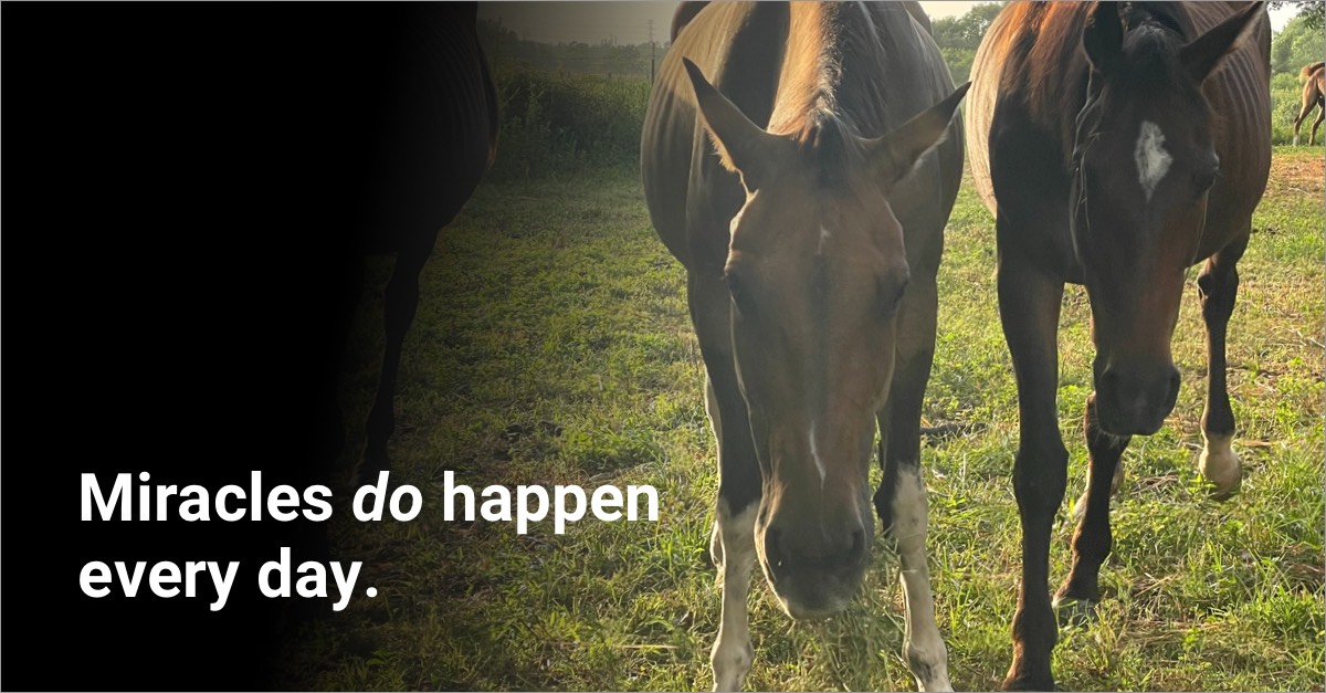 Miracles do happen every day. Your holiday gift will nourish the bodies and warm the hearts of rescued horses at Miracle Ranch. Help us give abused and neglected horses a life they never imagined. This holiday season, celebrate the promise of even more miracles in the year to come — and remember, your gift is tax deductible by 12/31!